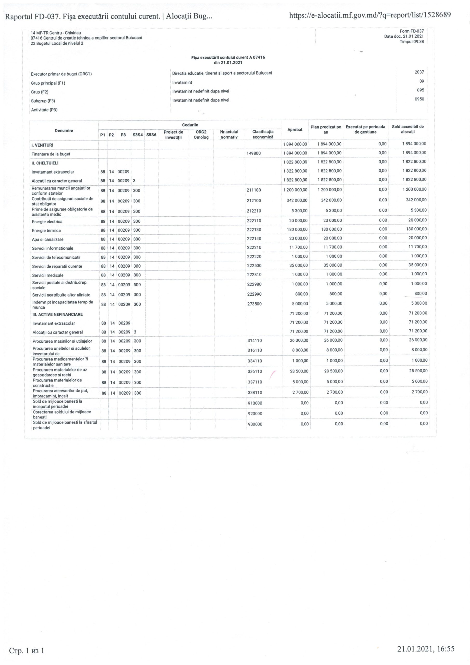 - Fișa executării contului curent A 07416 din 21.01.2021