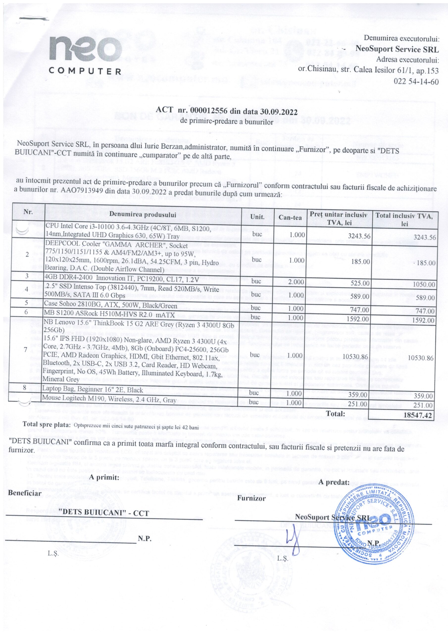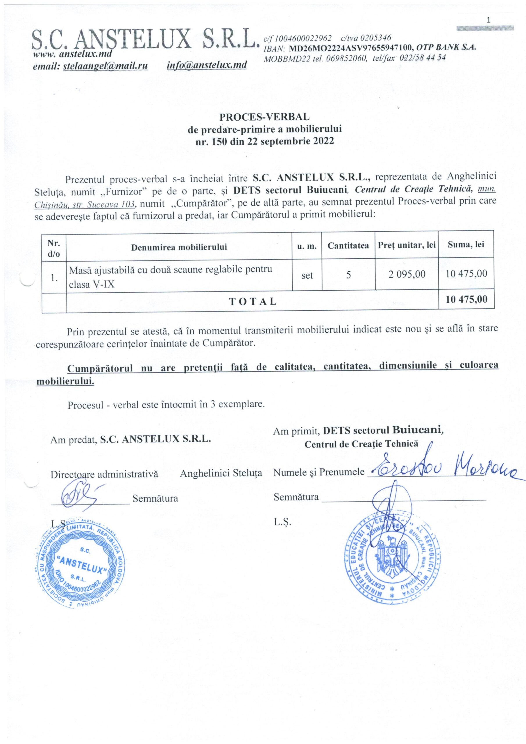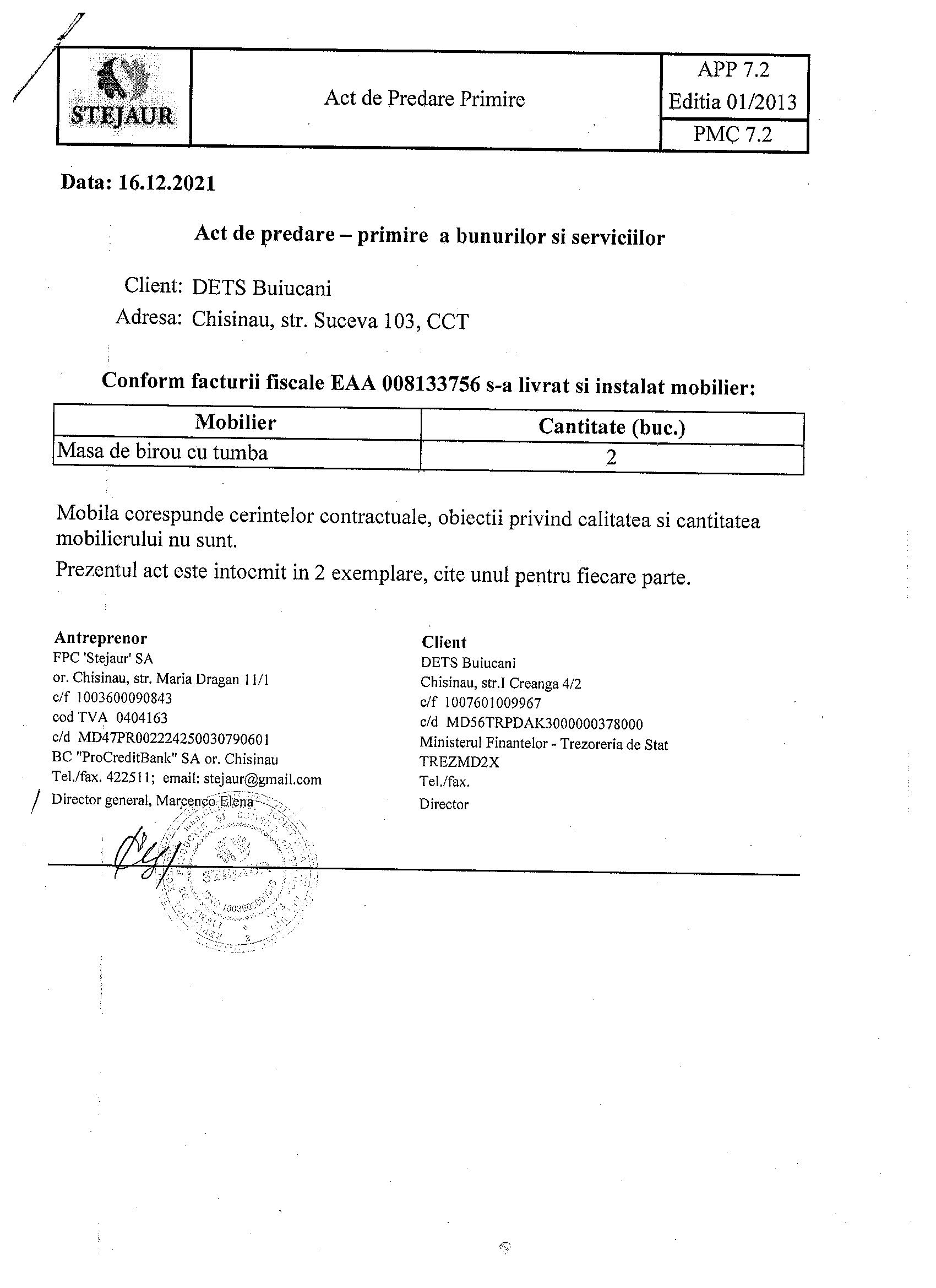 - Act de primire- predare a mobilierului din 16.12.2021